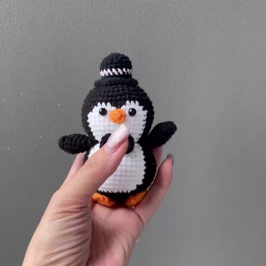 Looking for a heartwarming and adorable gift? This crochet penguin couple is a perfect choice! Each plush is meticulously handmade using soft velvet yarn, featuring a charming male-female duo – the gentleman in a cozy hat and bow tie, and the lady with a cute pink bow headband.