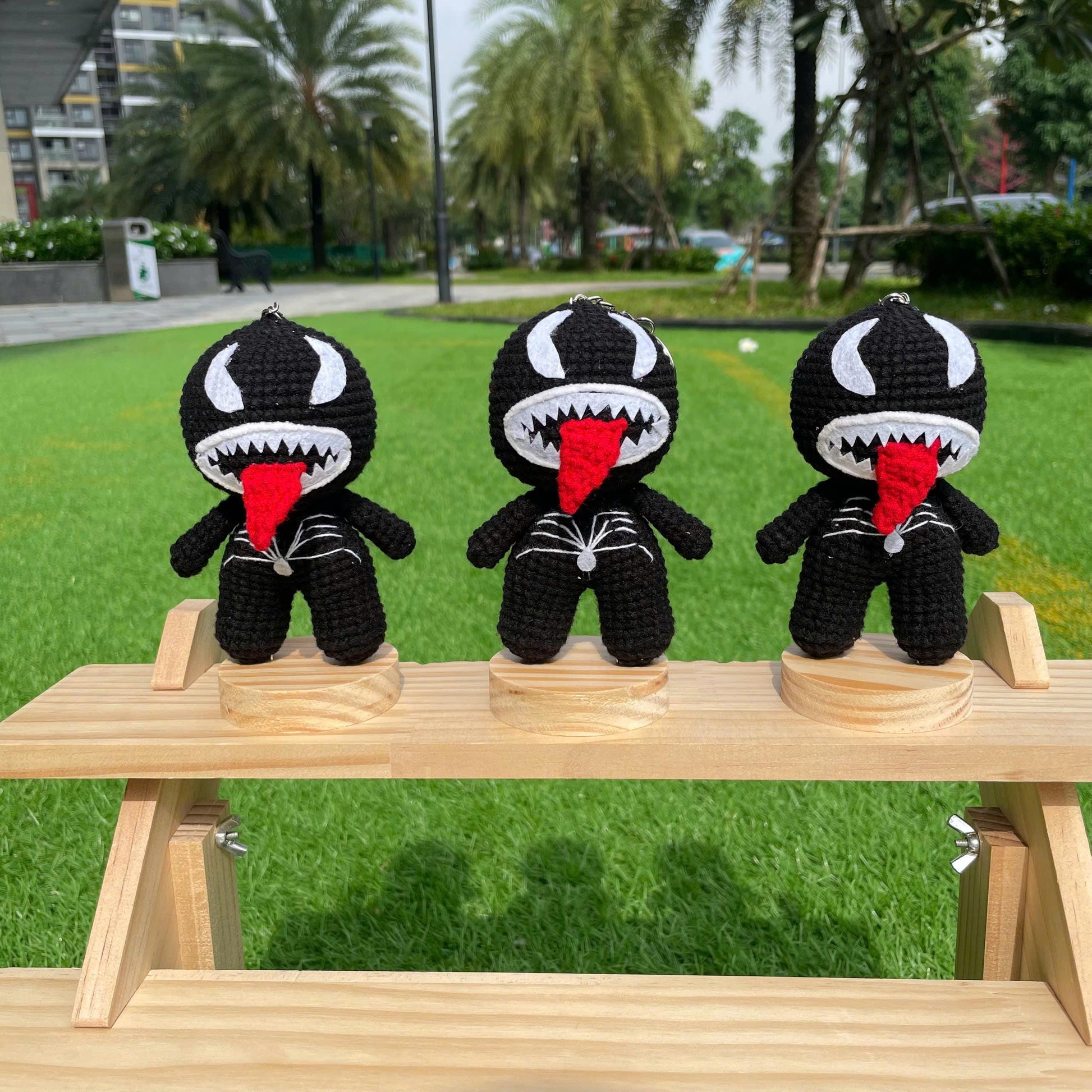 Bring a mischievous vibe to your accessories with this handmade crochet Venom keychain! Featuring his iconic teeth and tongue, this amigurumi doll makes a fun collectible or unique gift for comic fans. Perfect for keys, bags, or geek collections.